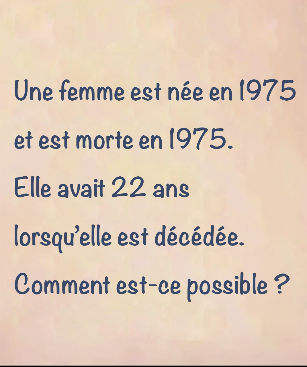 Imaginez : vous tombez sur cette phrase étrange en faisant défiler votre fil d’actualité. « Une femme est née en 1975 et décédée en 1975. Elle avait 22 ans. » Ça vous stoppe net. Incompréhensible ? Déconcertant ? Forcément, il y a un piège quelque part… Mais où ? Accrochez-vous, car cette énigme bouscule notre … Read more